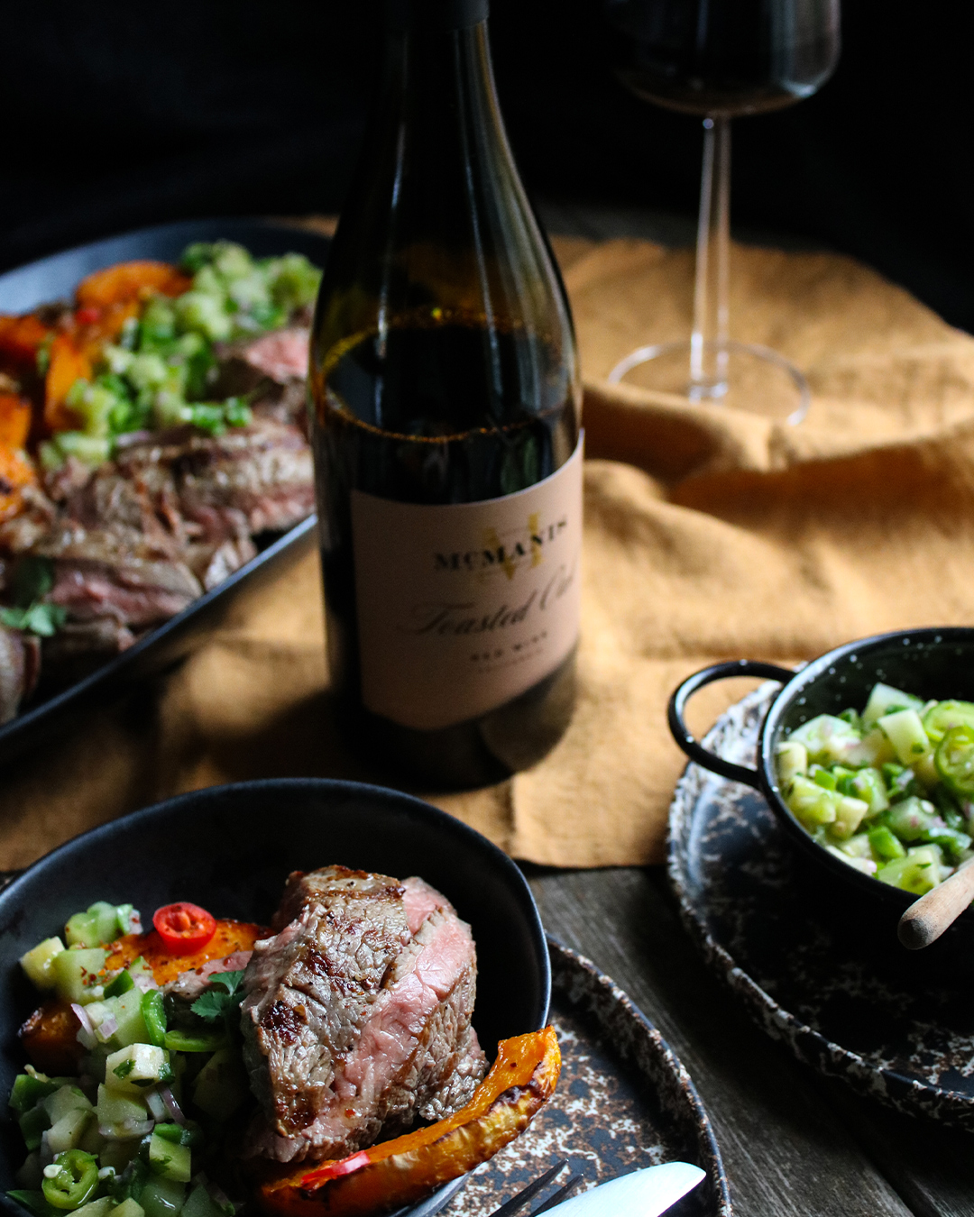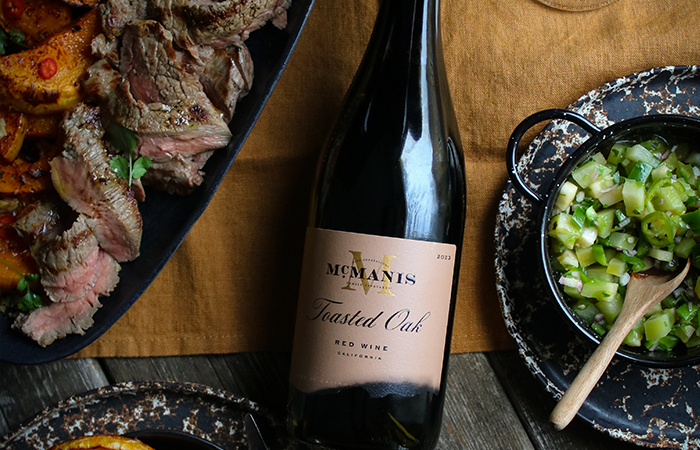 4. Salta och peppra biffen och grilla sedan snabbt några minuter på varje sida – låt vila under folie 10 min innan den skärs upp på snedden tvärs över fibrernas riktning. Servera allt tillsammans och toppa med grovhackade valnötter som rostats i torr stekpanna. Perfekt med McManis Toasted Oak i glaset.